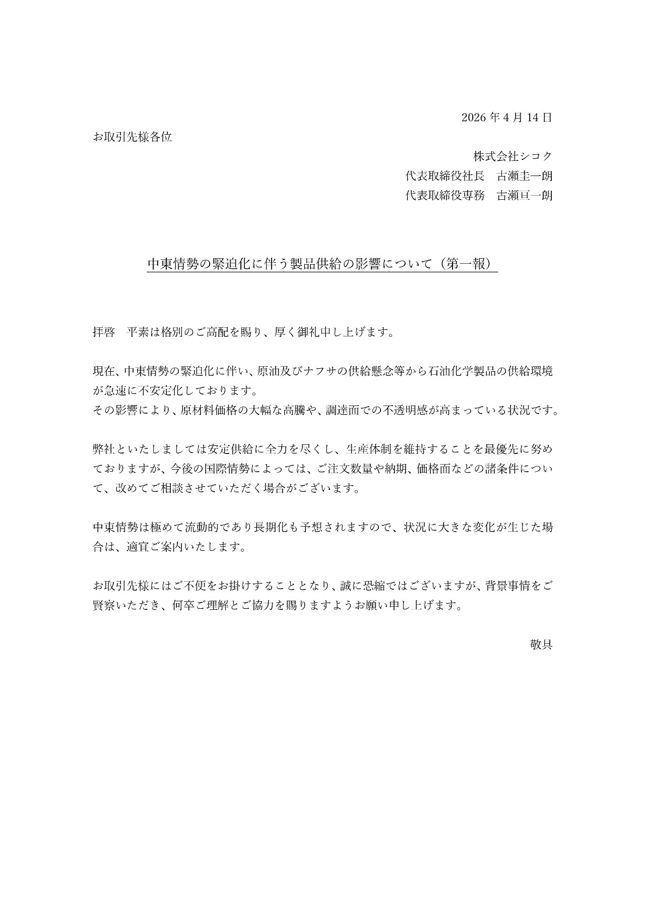 中東情勢の緊迫化に伴う製品供給の影響について(第一報) 2026年04月14日 | お知らせ 平素より格別のお引き立てを賜り、厚く御礼申し上げます。 弊社の今後の製品供給体制に関しまして、下記の通りご案内申し上げます。 中東情勢の緊迫化に伴う製品供給の影響について(第一報) facebook twitter line