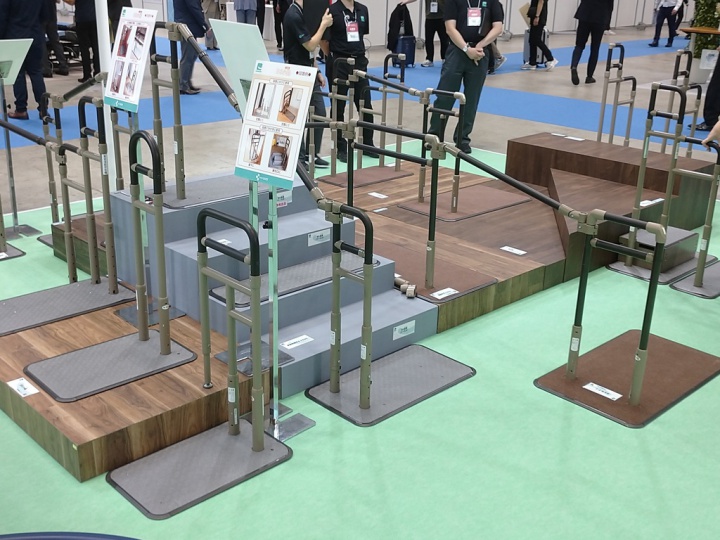 続いて、上記写真の手前左側に展示している狭いスペースでも置きやすいコンパクトな手すりの『BS小路(こみち)』です。すでにご利用いただいている方や、設置経験のある方から多くの反響をいただきました。玄関まわりはもちろん、リフォームで生じた屋内のちょっとした段差対応など、幅広いシーンで活躍しているとのお声も寄せられ、ほほえみスタッフ一同大変嬉しく感じております。